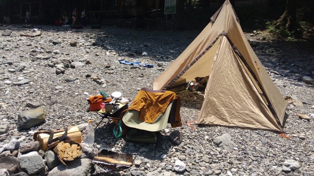 奥多摩駅から徒歩10分ぐらいで「氷川キャンプ場」に到着。足場は石ころだらけで、初張のワンポールテントのポールがまっすぐに立たず苦戦。